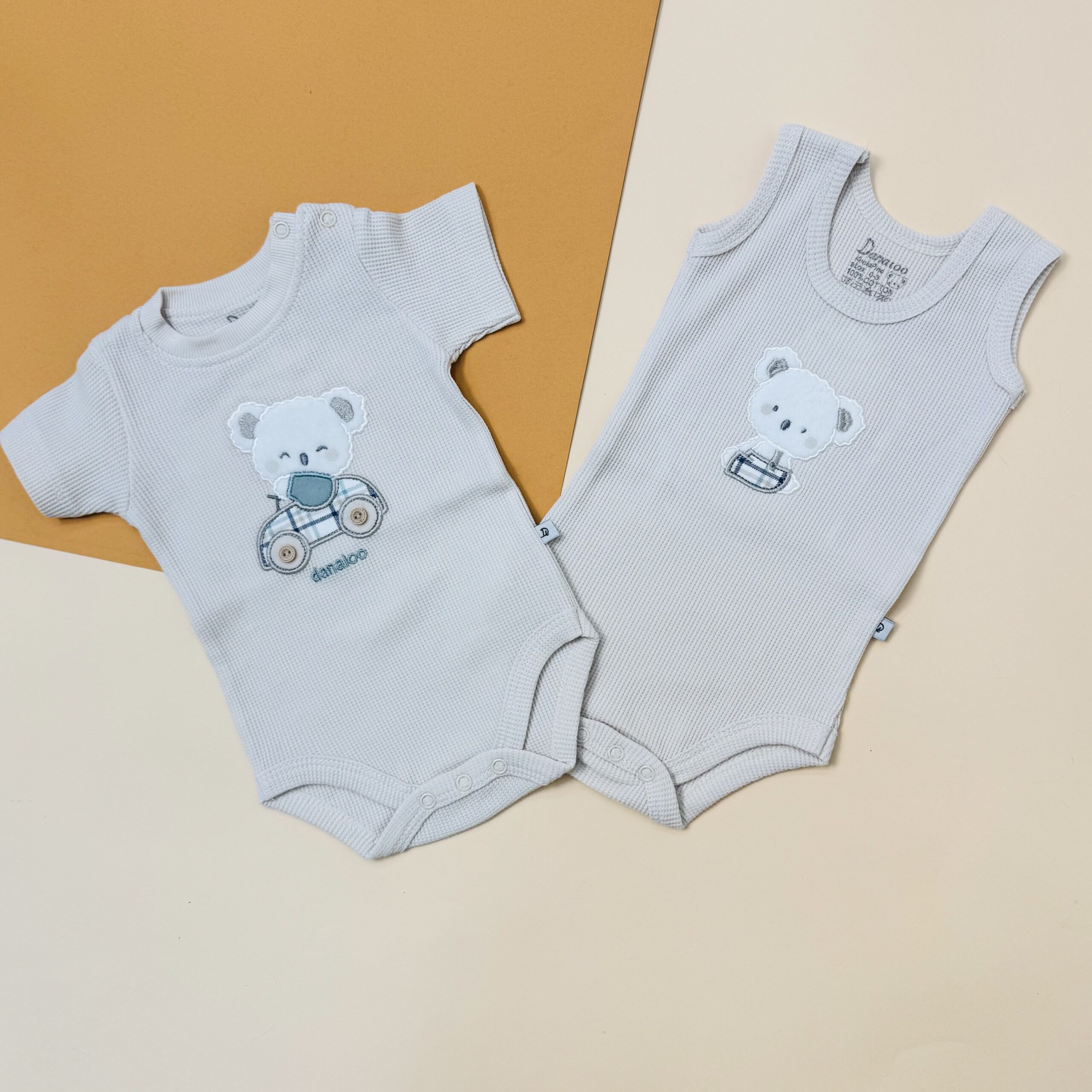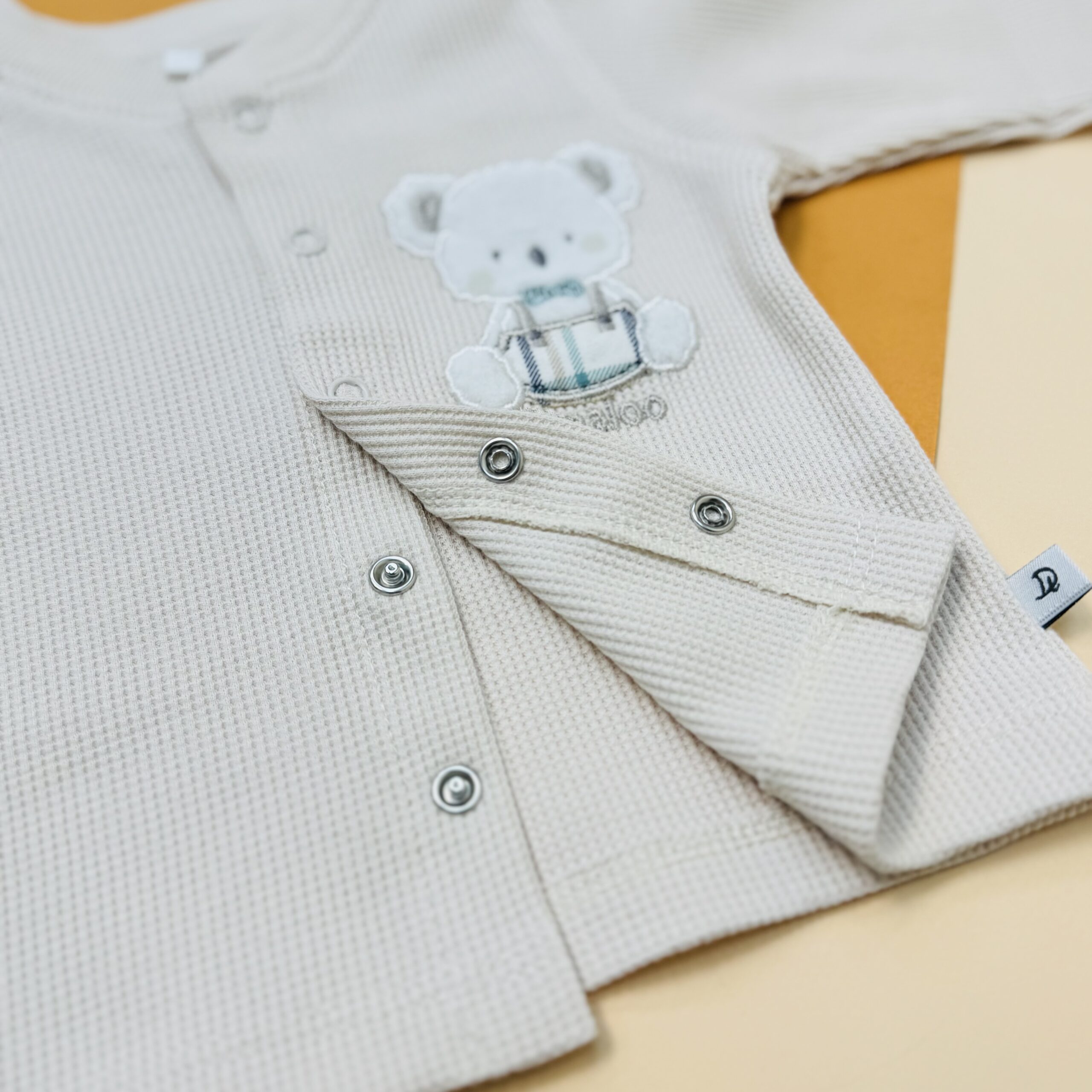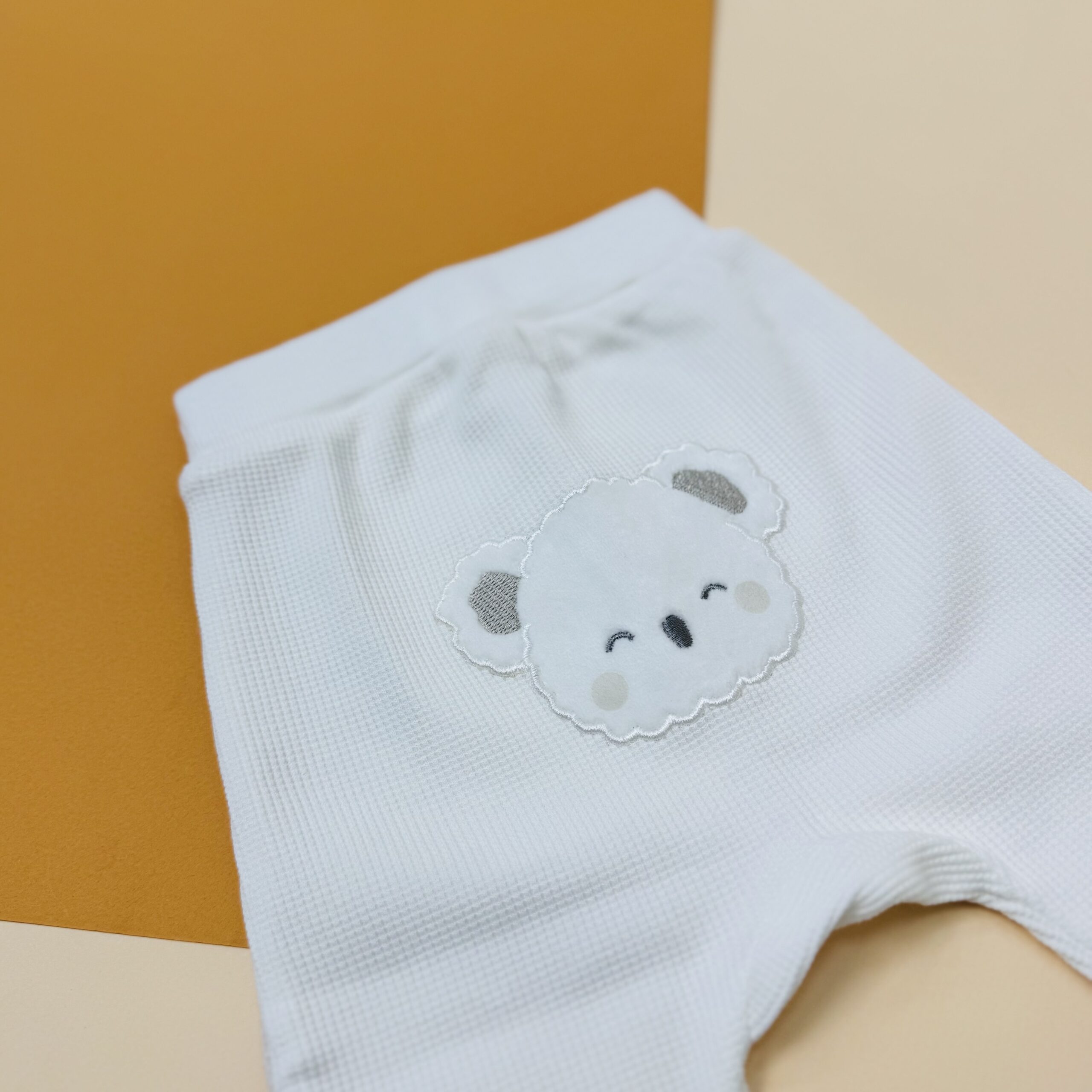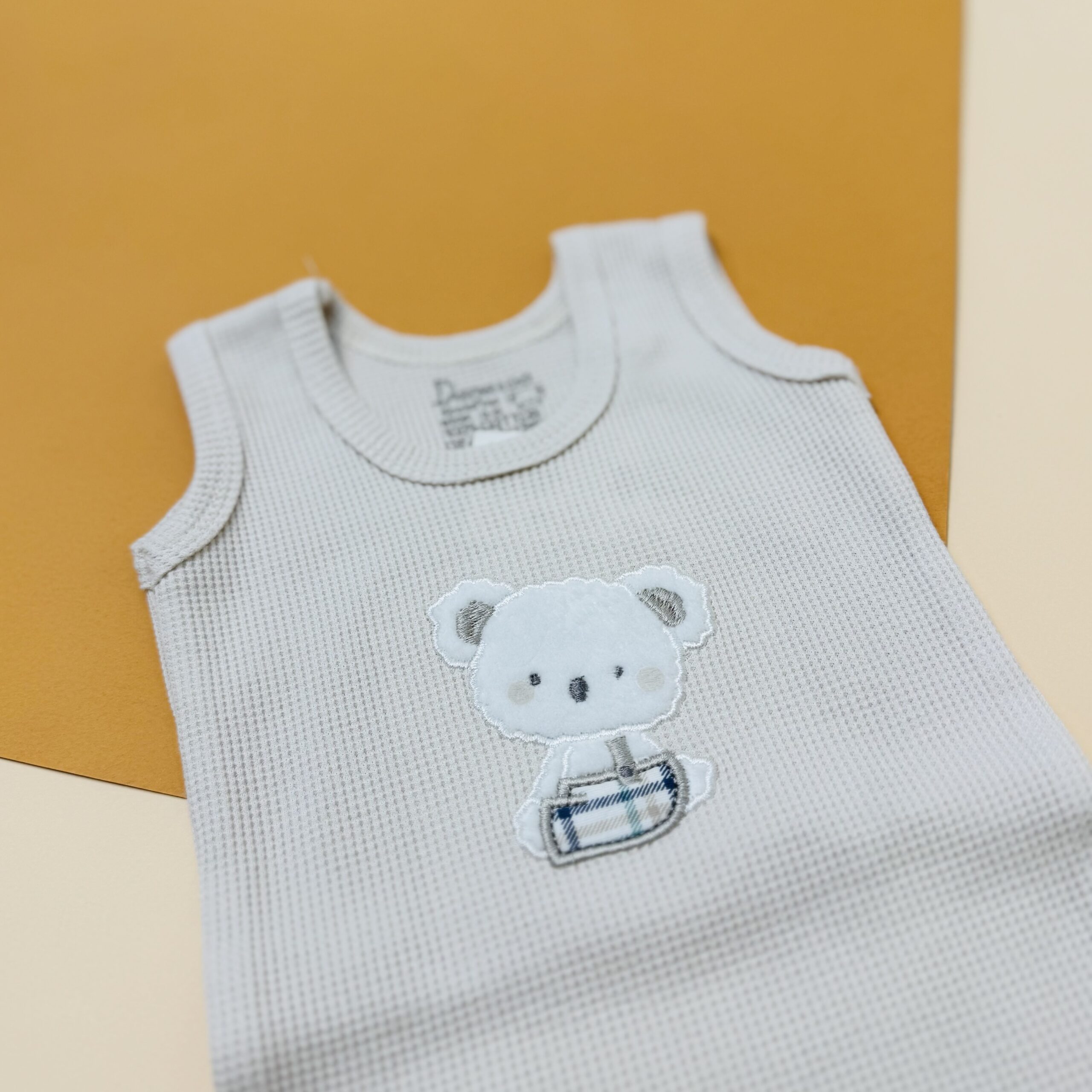 جنس پارچه چنبه بیسکوییتی همراه با تیکه دوزی طرح کوآلا بدون حساسیت و آسیب به پوست نوزاد.