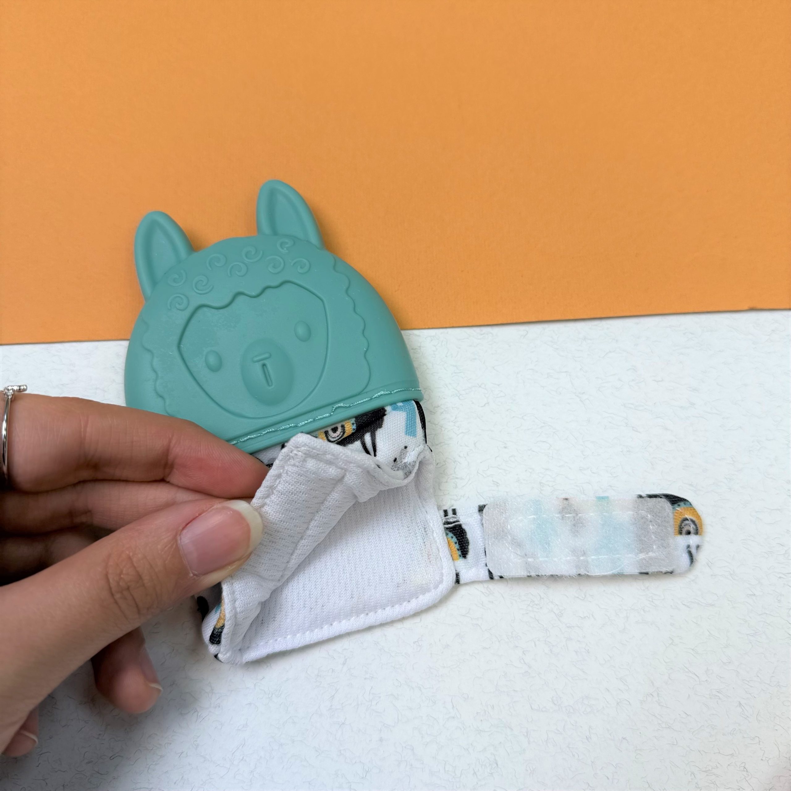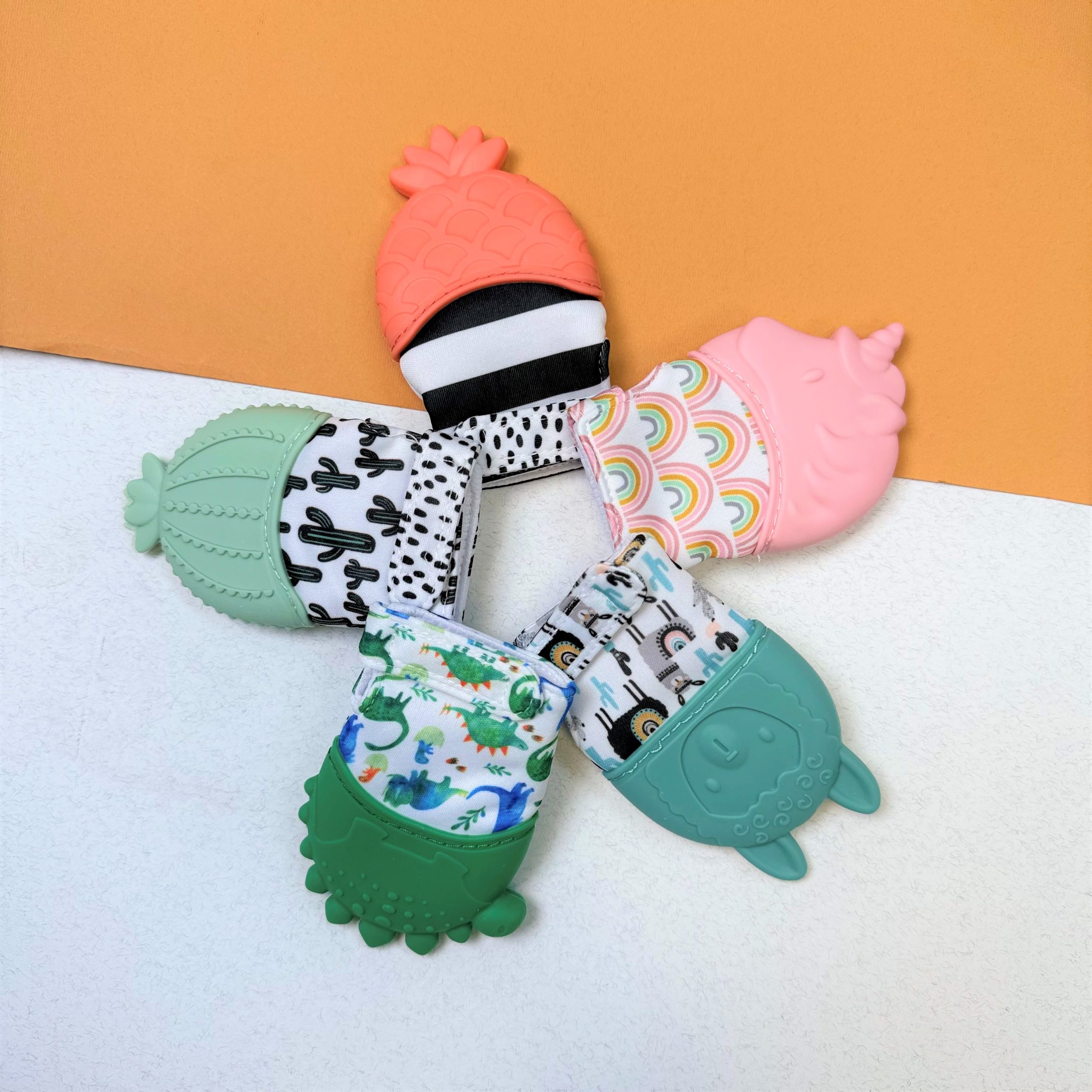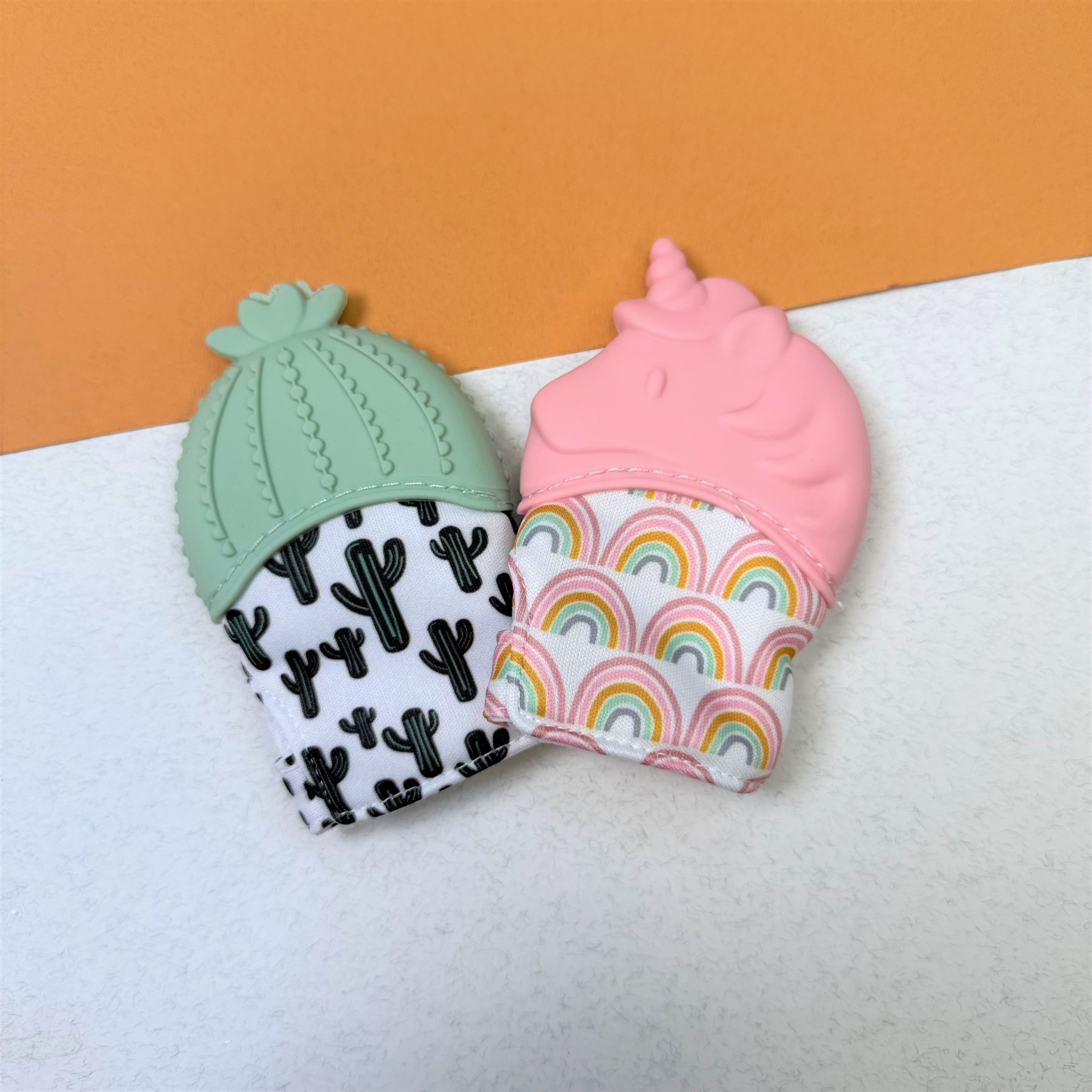 دستکش دندانگیر قسمت پایین دستکش از جنس پارچه ای بوده و قسمت پایین دستکش دارای یک قسمت با بست چسبی با قابلیت باز و بسته شدن جهت تنظیم سایز دور مچ نوزاد،  قسمت بالای دستکش جنس پلاستیک نرم با برجستگی و فاقد مواد مضر است، مناسب برای ۳ تا ۱۲ ماهگی