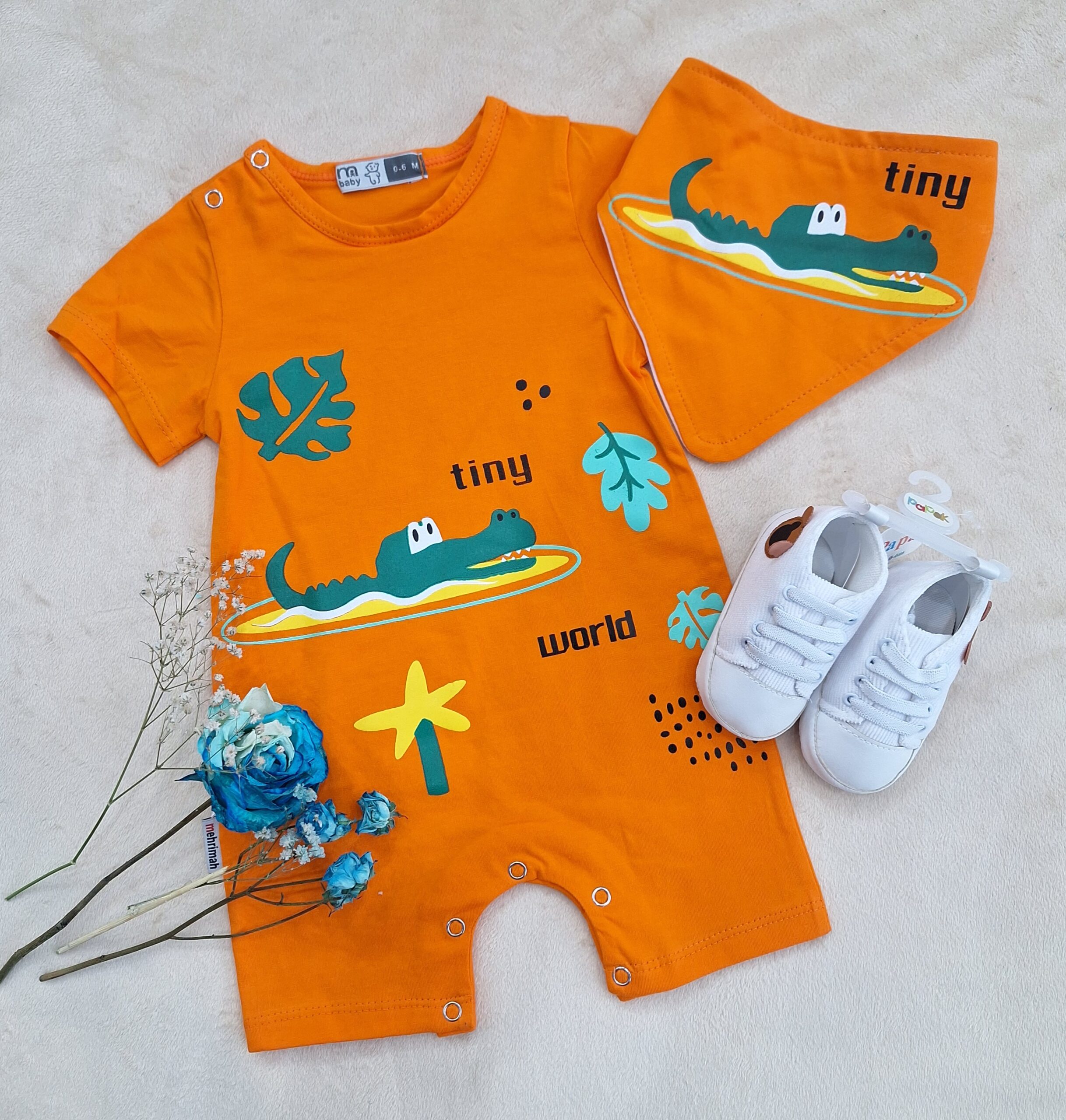 رامپر تمام پنبه با کیفیت همراه با دستمال گردن، برند مهری ماه که دارای چاپ زول بدون پوسته پوسته شدن و ترک خوردن است.🌺