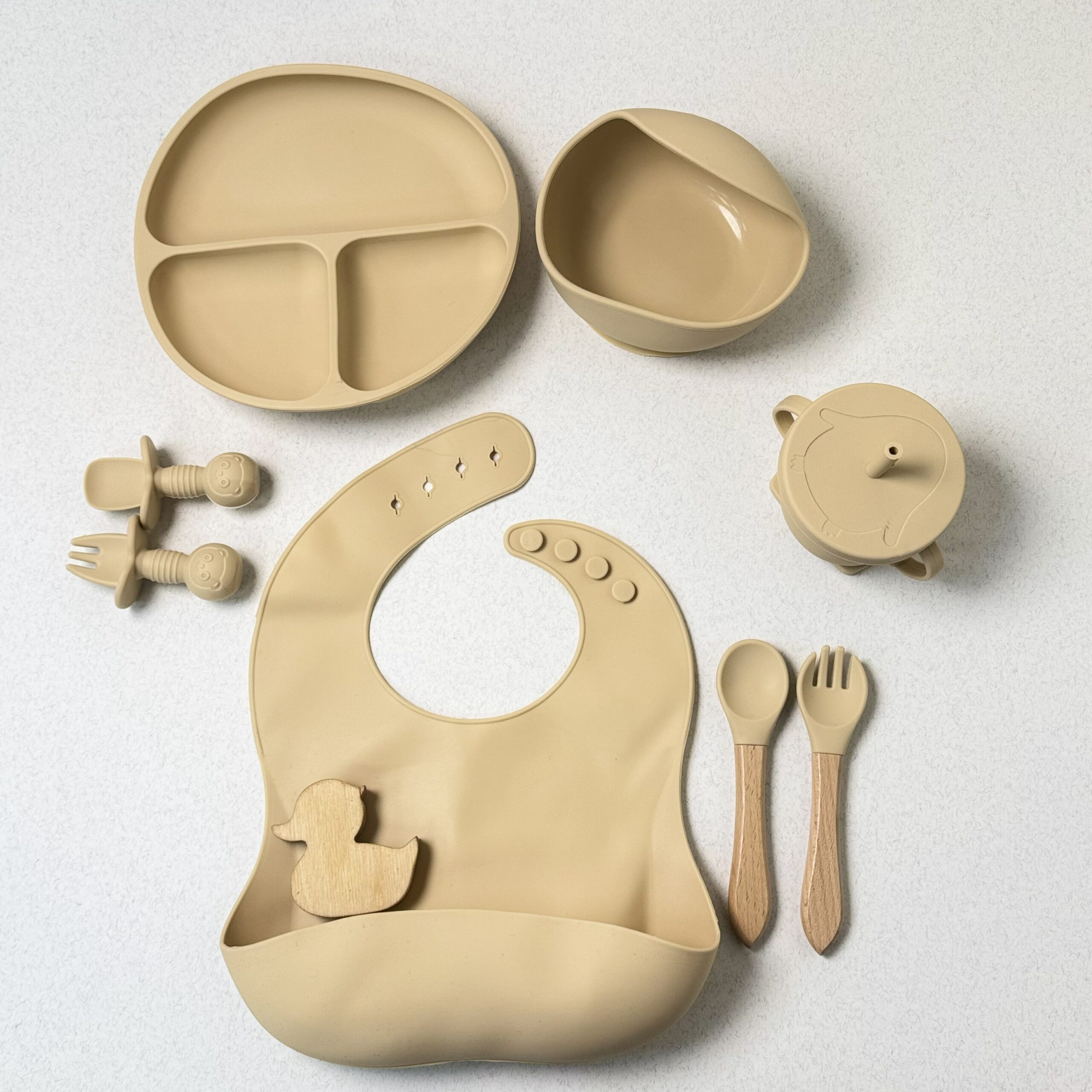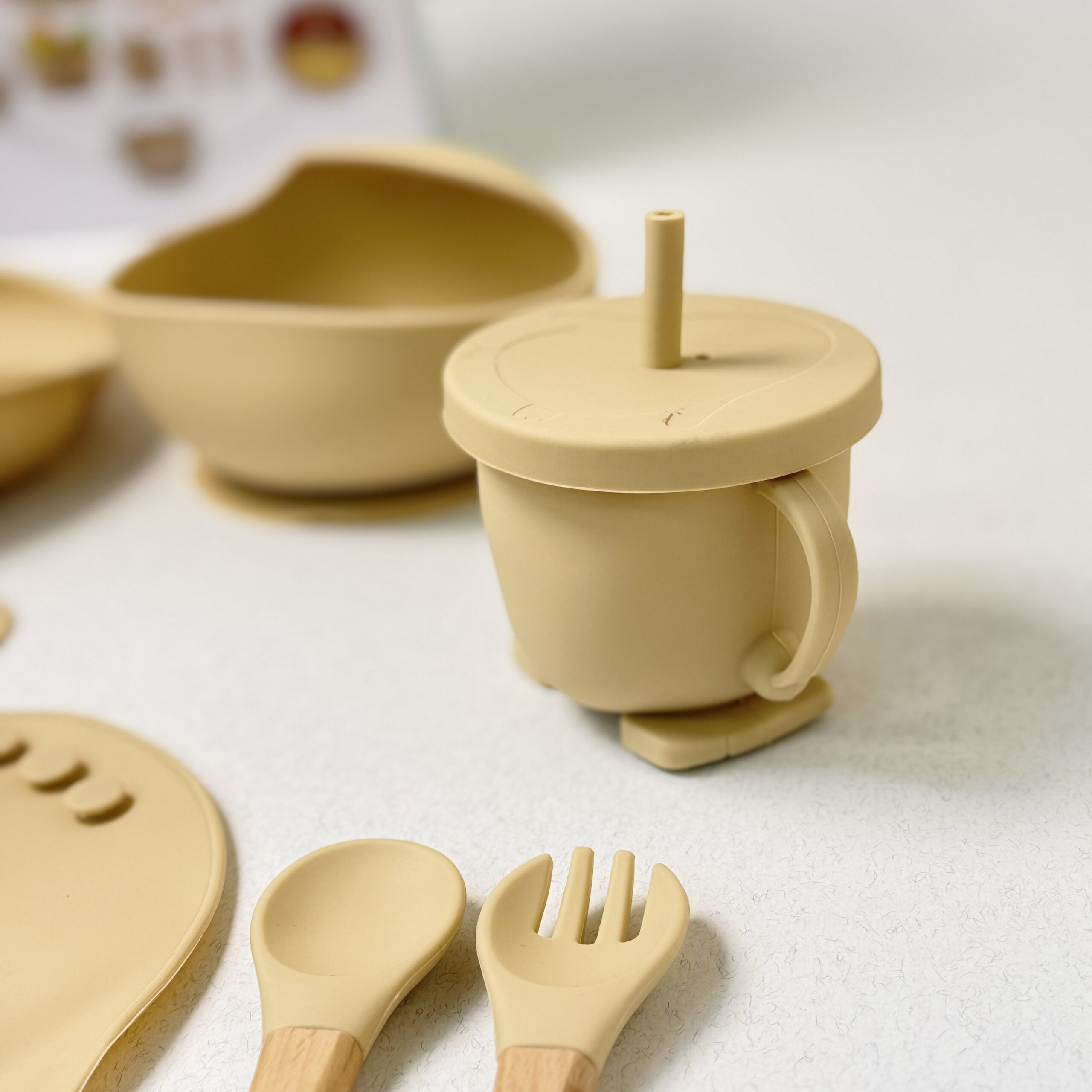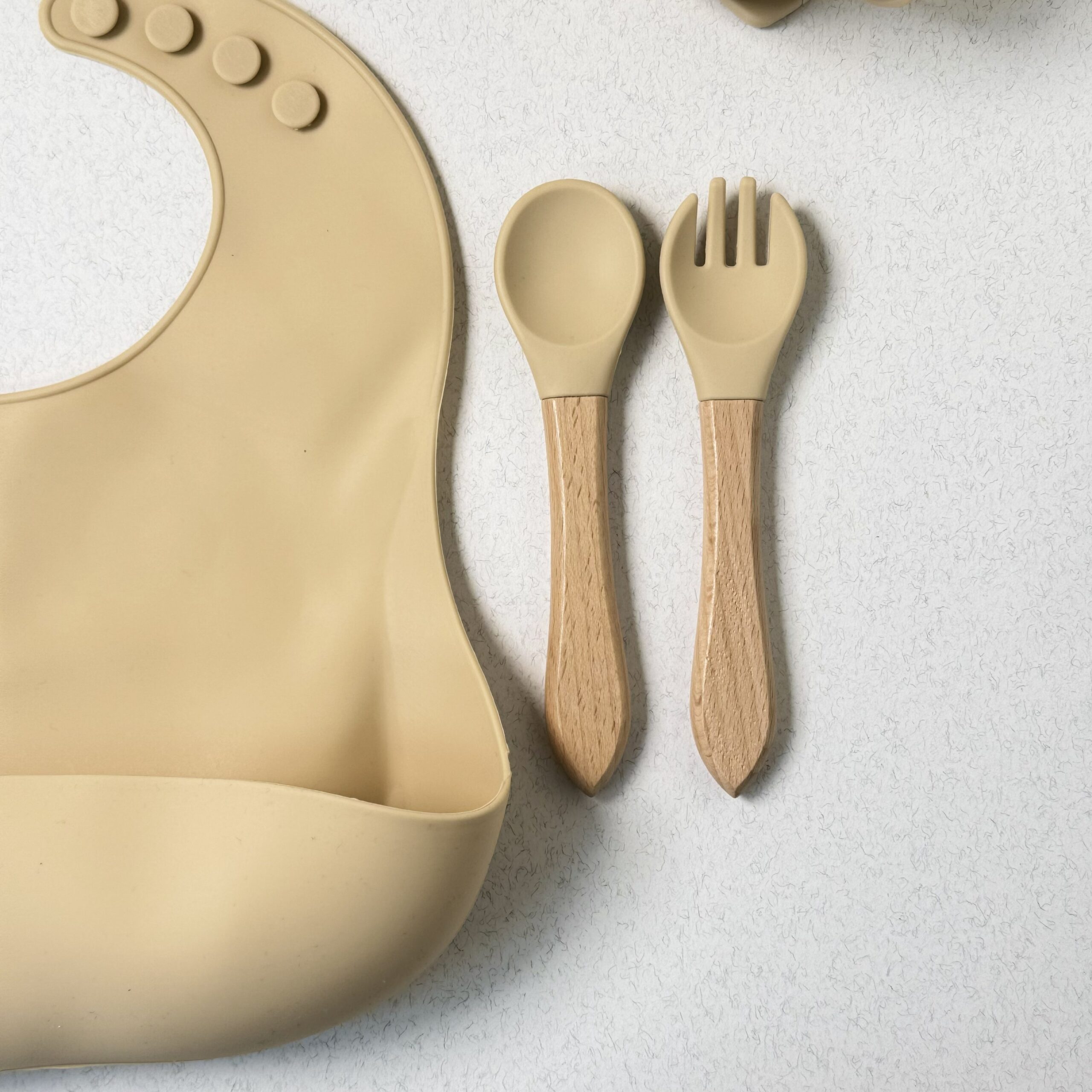 بشقاب ، پیشبند ، قاشق دسته چوبی ، چنگال دسته چوبی ، قاشق کامل سیلیکونی ، چنگال کامل سیلیکونی ، کاسه ، لیوان نی دار